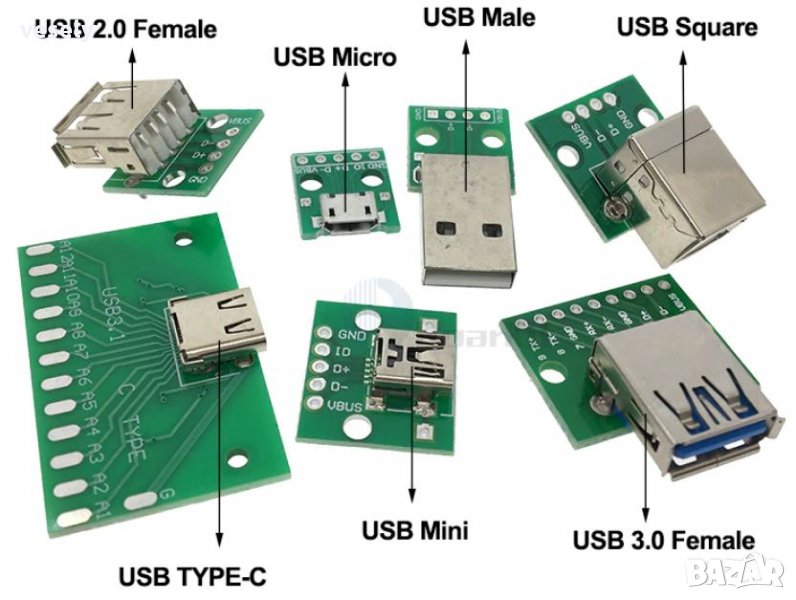 Комплект от 7 броя USB адаптера за тестване на произволни устройства с налични USB куплунги. Адаптерите са опроводени платки 2.54мм DIP PCB със всички възможни USB-куплунги.