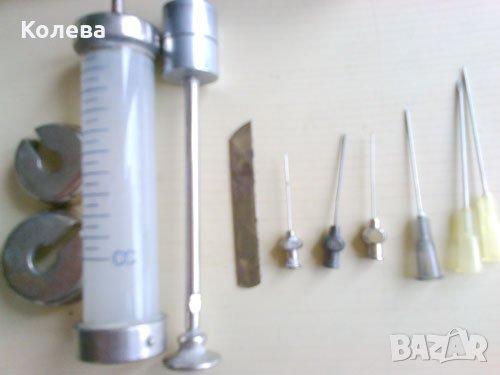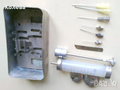 Антикварен комплект от спринцовка за многократна употреба, кутия за съхранение и изваряване, 6 различни по размер игли и ножче за рязане на ампули. От 50-те години на миналия век. Употребявани /в Асеновград/. Цена 15 евро.
