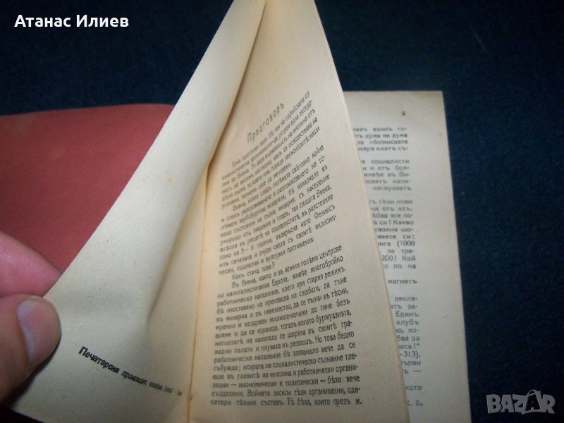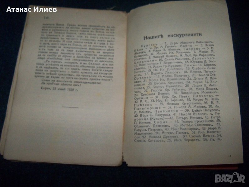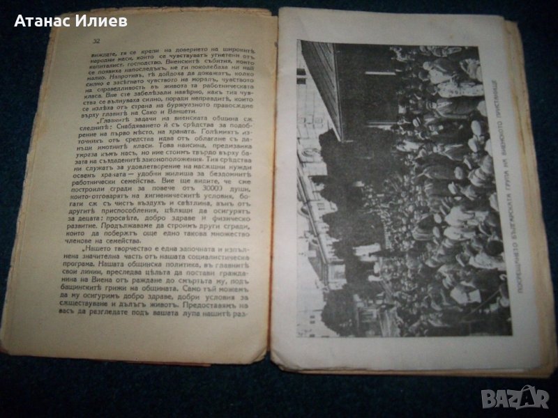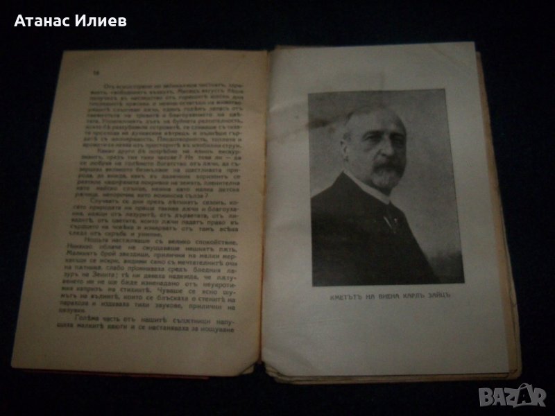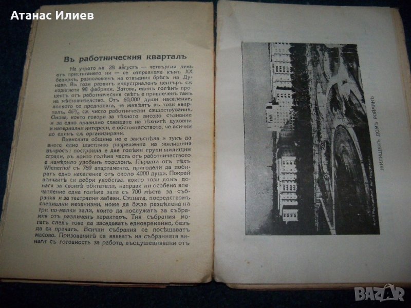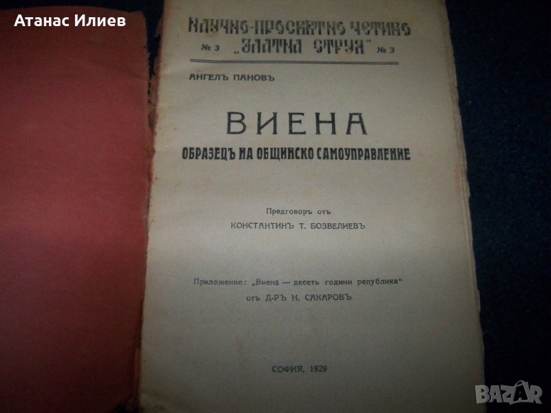"Виена образец на общинско самоуправление" от Ангел Попов, с предговор от Константин Бозвелиев и приложение "Виена - десет години република" от д-р. Никола Сакаров. Книгата е издадена през 1929г. след нарочна екскурзия до Виена, в поредицата "Научно - просветно четиво "Златна струя". Книгата е с меки корици, с фотографии, 120 стр. Съдържа и списък на екскурзиантите.