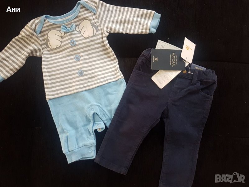 Чисто нови джинси с етикет на Mayoral.Купувани за 2 пъти повече. Подходящи за подарък.По етикет са 6 месеца.Към тях подарявам оригинален ромпър с папийонка. Носен,без забележки.