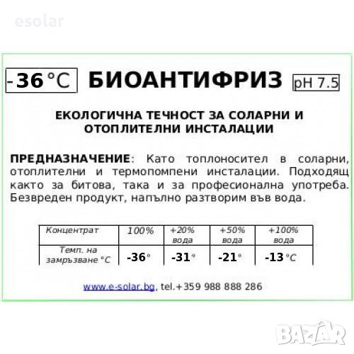 НОВО Биоантифриз - НАПЪЛНО БЕЗВРЕДЕН - топлоносител, аналог на монопропилен гликола. Произведен е на базата на биоглицерол и добавки. Може да се използва в соларни и отоплителни инсталации, чилъри, може БЕЗПРОБЛЕНМО да се смесва с пропилен гликол (при допълване на инсталации), не образува пяна, НЕ Е ТОКСИЧЕН (за разлика от етилен гликола). Цената е за литър концентрат -36 градуса, като може да се разрежда с вода. Продуктът е pH неутрален (7.1-7.5), което гарантира безпроблемна работа при контакт с метал, пластмаса, гума, кълчища и т.н.. Стандартните разфасофки са по 10 (за по-големи по договаряне).