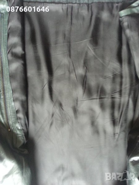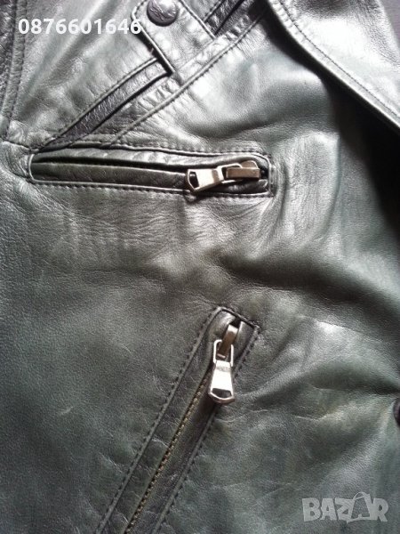 Изработено е от 100% естествена и изключително мека кожа. обличано е точно 2 пъти, а купувано от Италия и тук няма просто откъде да го купите. Без каквито и да е следи от носене. Дори и подобен модел в магазините на Massimo Dutti не можете да намерите! Цената на която е купувано е три пъти по-висока и то при положение че беше намалено от тази която му търся. Цветът му е тъмно-зелено-сив и е с много ефектна дизайнерска кройка. Късо, вталено с ревери, ципове в долният край на ръкавите и общо 9 джоба(8 предни+вътрешен). Ето и някои размери: Дължина от основата на яката до долният край по гърба 63 см. Дължина на ръкава премерен от горният край на рамото до долу 68 см. Дължина на ръкава по вътрешната страна от под мишницата до долу 50 см, ширина от под мишниците в закопчано положение мерено по гърдите е 57 см. Закопчаването отпред е освен с цип и с капси. Всички ципове и капси се закопчават безупречно.