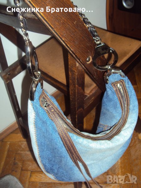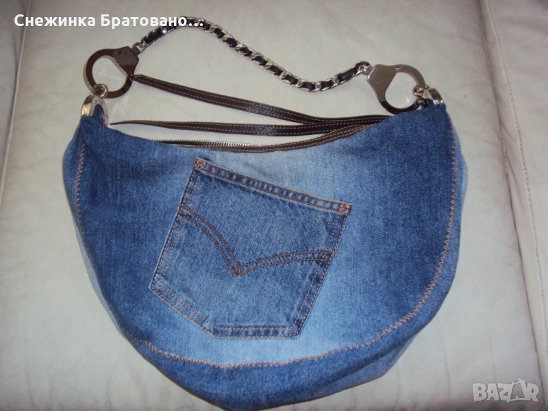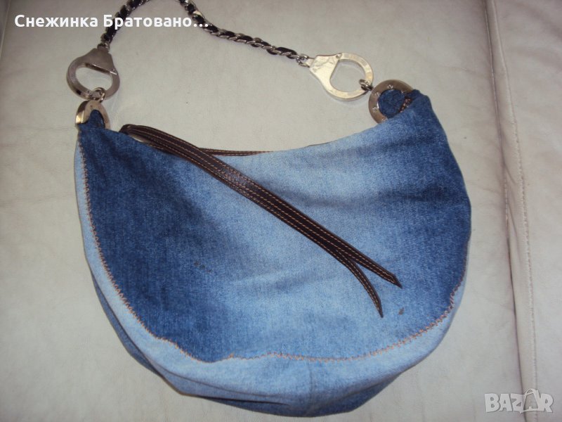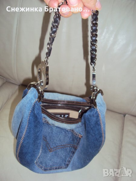 100% оригинална маркова дънкова чанта на GILLI .Купена от Италия. Дръжката е синджир, в който е вплетена естествена кожа. Просто не е моя визия. Тип торба е. Вътре има голям джоб за аксесоари и един малък насрещен за телефон или други неща! Стилна и модерна визия! Носена до пъти!