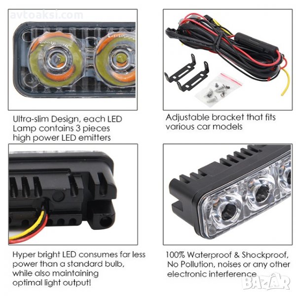 Комплекта съдържа 2 броя дневни светлини с мощни 3 бр. диоди с ниска консумация.