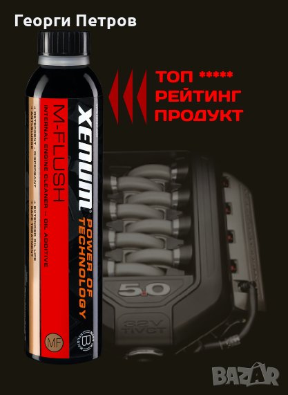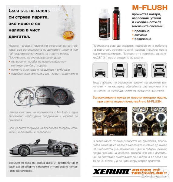 Всички ние гарантираме за M-Flush, продукта на белгийските лаборатории XENUM. Прецизно и абсолютно безопасно премахва всички налепи, нагари и утайки от двигателя и картера, като те се източват напълно със старото масло.