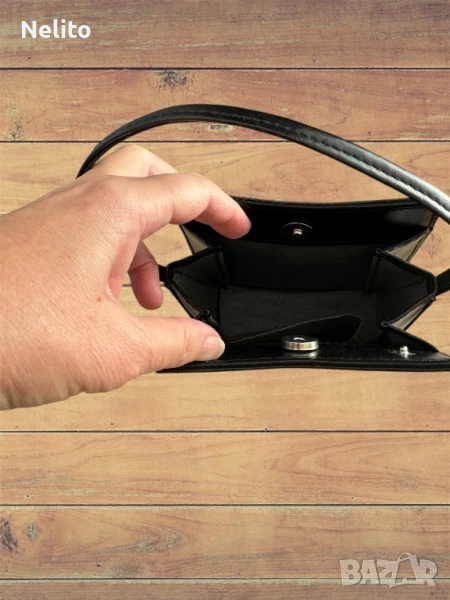 *Малка черна вечерна и елегантна чантичка от естествена кожа, с размери 14/14/5 и дръжки 12см. Закопчава се с копче магнит и има джоб за телефон. Ивиците в предната част са леко бляскави. Използвана е веднъж.