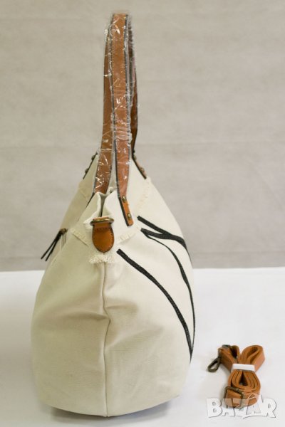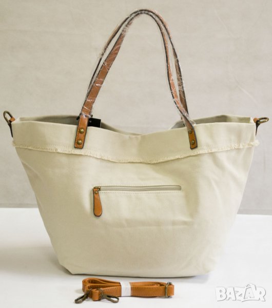 Дамска чанта в бежово с две цветни фиксирани дръжки и допълнителна дълга дръжка. Има едно основно отделение вътрешен и външен джоб с цип и отделение за телефон.