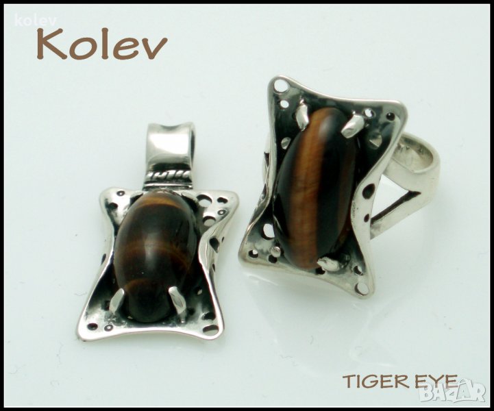 АВТОРСКИ КОМПЛЕКТ - УНИКАТ - С ЕСТЕСТВЕН КАМЪК ТИГРОВО ОКО с размер 20/10 мм, ИЗРАБОТЕН ОТ СРЕБРО ПРОБА 925 тегло ок. 26 грама Комплектът се състои от медальон, пръстен и обеци ръчна изработка НА МАЙСТОР КОЛЕВ - големина на плочката на трите части 24/16мм размер на пръстена № 58 см ПОЛУЧАВАТЕ СЕРТИФИКАТ ОТ АВТОРА И ГАРАНЦИЯ ОТ МАГАЗИН