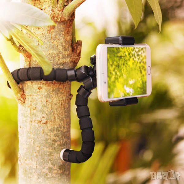 Стойка за телефон или фотоапарат, която позволява да поставите телефона или апарата на трудно достъпно място, тъй като краката на стойката се огъват и може да се закрепи на различни места.