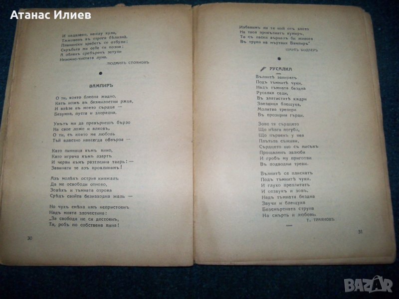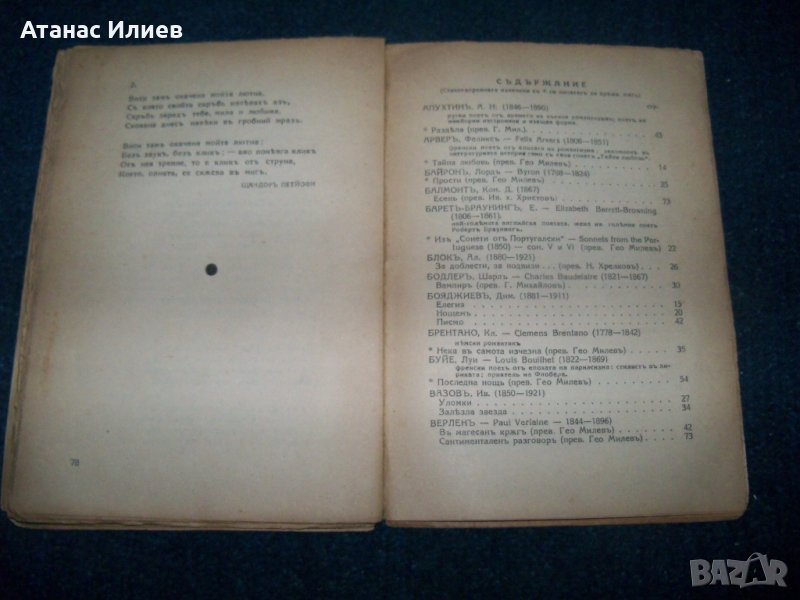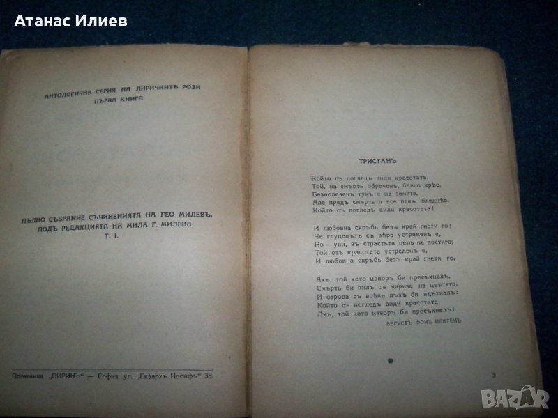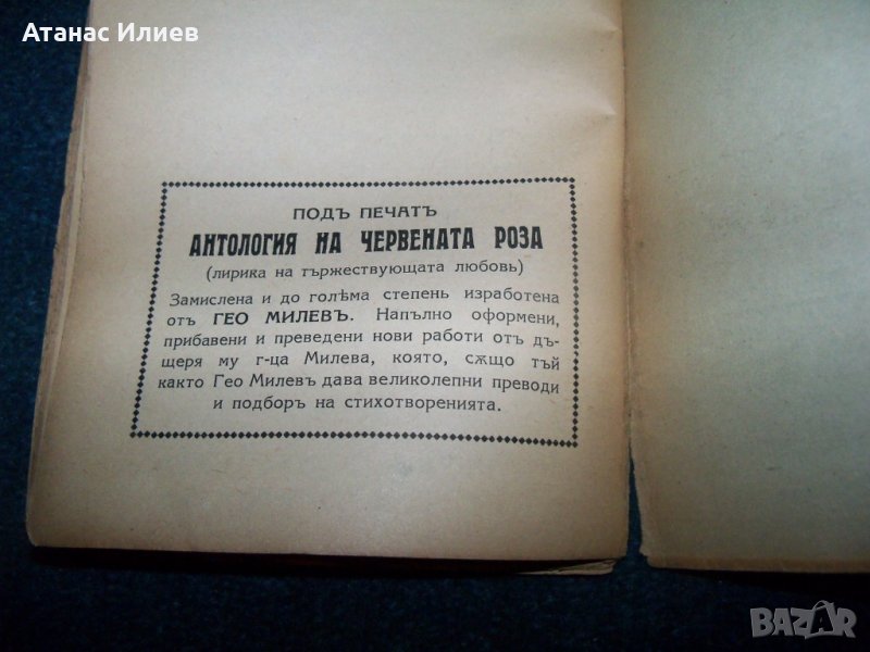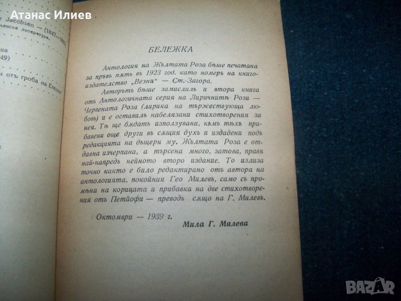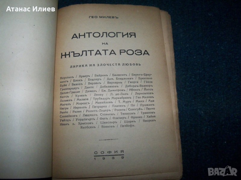"Антология на жълтата роза - лирика на злочестата любов" автор на антологията Гео Милев, книгата се издава под редакцията на дъщеря му Мила Гео Милева. Книгата е издадена през 1939г., 88 стр. с меки корици. Първа книга от антологичната серия на лиричните рози. Всички книги са от личната ми колекция.