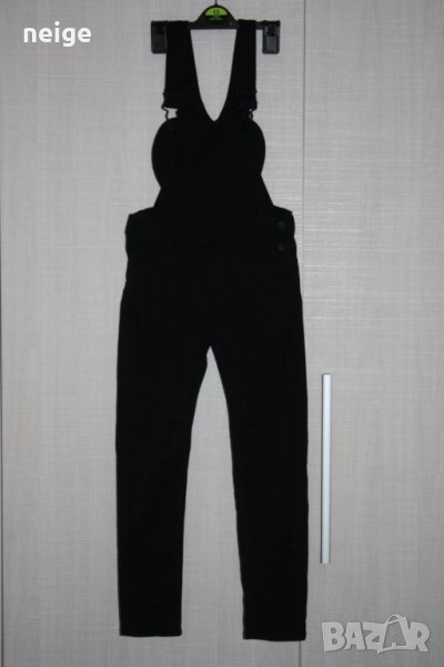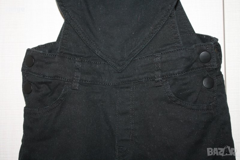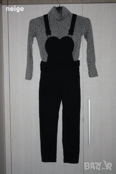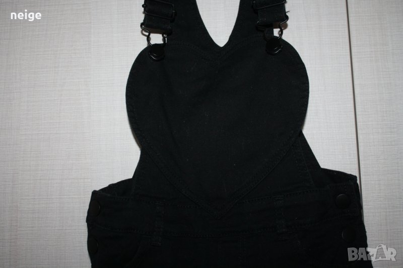 По етикет е за 6-7 години, но според мен от слабо дете може да се носи и до 8 години, та дори и повече. Презрамките се коригират на дължина, а крачолите може да се навият ако са дълги. Не е подходящ за пухкаво момиченце. Моделът е слим, не е свободен. Седи прекрасно на слабичко дете. Денимът е от плътния, подходящ за студен сезон. Цветът е черен. Платката отпред е във формата на сърце. Винаги може да се разкраси с апликации, самозалепващи, ако не ви допада изчистения модел. 98% памук, 2% еластан.