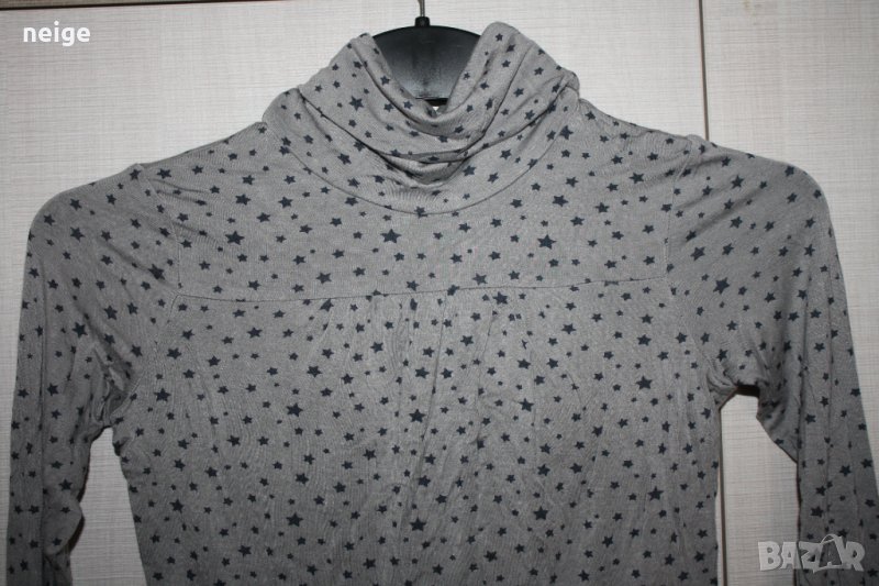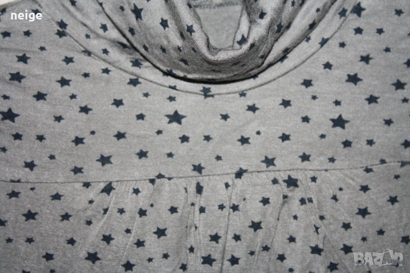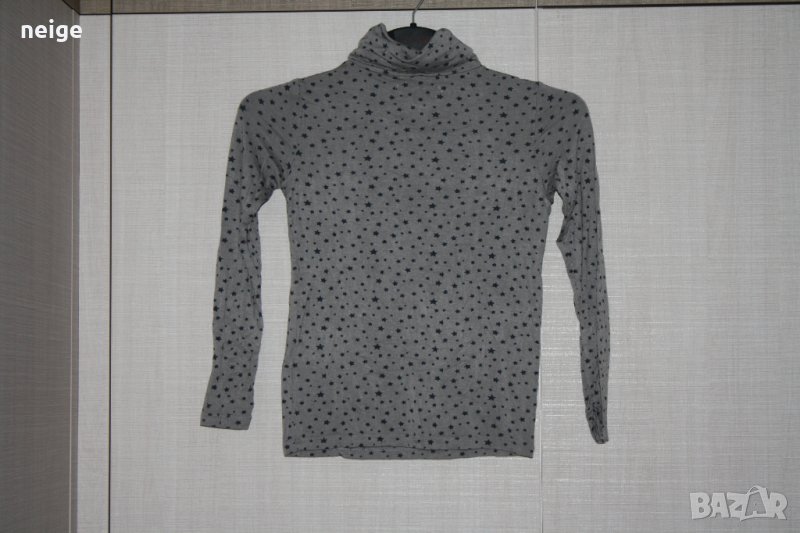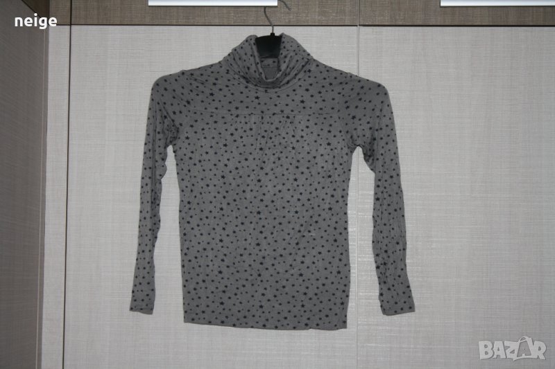 Блузката е в отлично състояние, слагана е 1-2 пъти, като нова е. Сивичка на звездички. Поло яка, платка с набор отпред. Маншетът е с набор по вътрешния ръб. Седи много елегантно. Може да се комбинира и с пухен елек или такъв от ажурно плетиво. Етикетът на вратлето е отрязан за удобство на детето, да не боцка. Състав на плата 97% вискоза, 3% еластан.