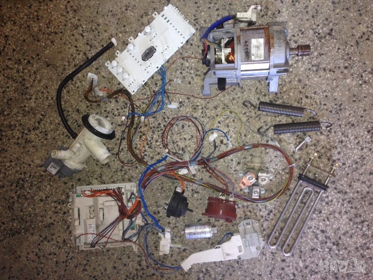 казана,барабана с преградките,металната конструкция, двете платки за управление,работния плот,горен гумен гофриран маркуч, колело през което минава ремъка,двигател,гумен маншон на шлюза и шлюза...