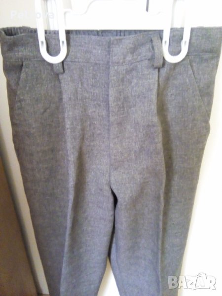 Ученически панталон за момче, подходящ за първи учебен ден и училищни празници и мероприятия, ползван 3-4 пъти, цвят графитено сиво, за 7-8 год., с ластик в кръста, цип здрав, има гайки за колан при нужда, два здрави джоба, не се мачка, размер от чатала надолу 55 см., от кръста надолу 78см.
