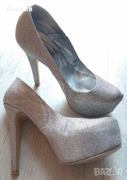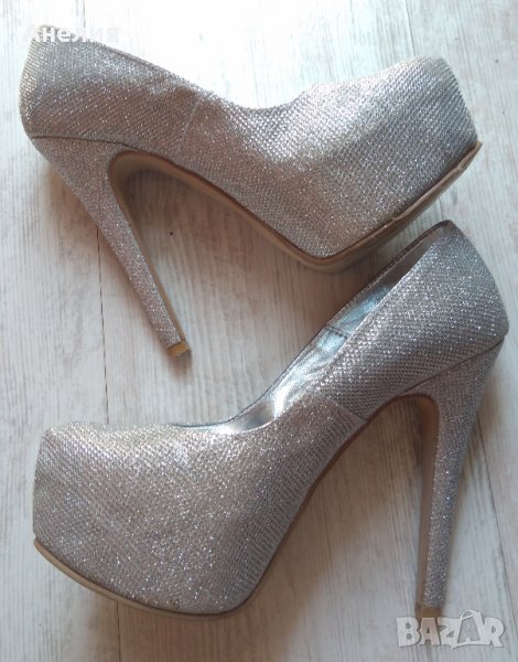 Официални дамски обувки за специален повод. Обувани веднъж, без забележки. Токът е с дължина 13.5 см., а платформата е 4 см. Номер 39. Изпращам с "Еконт" с 10% отстъпка от цената за доставка. Може и със "Спиди".