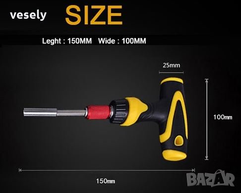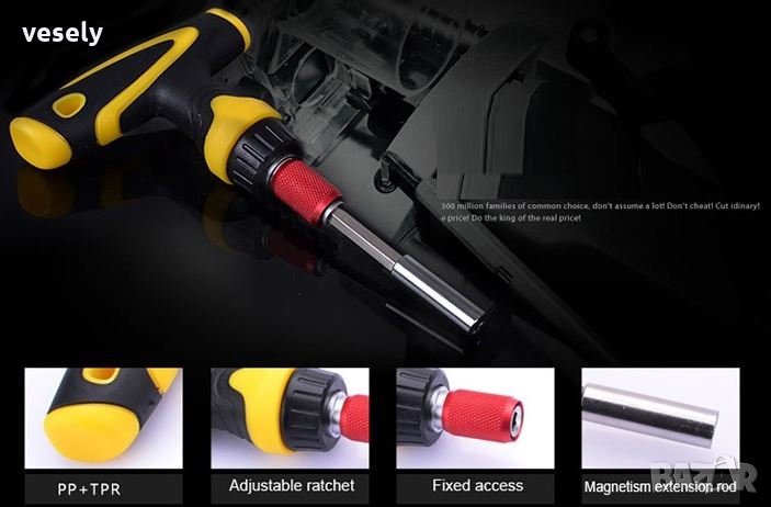 Многофункционална дръжка с тресчотка (ляво,дясно,блокада) с храпов механизъм за изтегляне на различна дължина магнетизирано стебло за битове 1/4 ‘’ 6.3mm от хромванадиева стомана с биматериална гумирана неприплъзваща се дръжка с размери 150х100мм. Отлично качество.