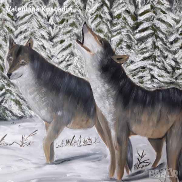 Маслена картина,,Вълци,, е рисувана с маслени бои върху платно с подрамка. Оригинална творба на художничката Валентина Костадинова. Размер 60/50 см. Безплатна доставка с наложен платеж до офис на Еконт. Подарък рамка.