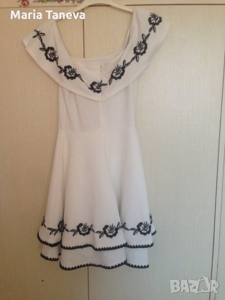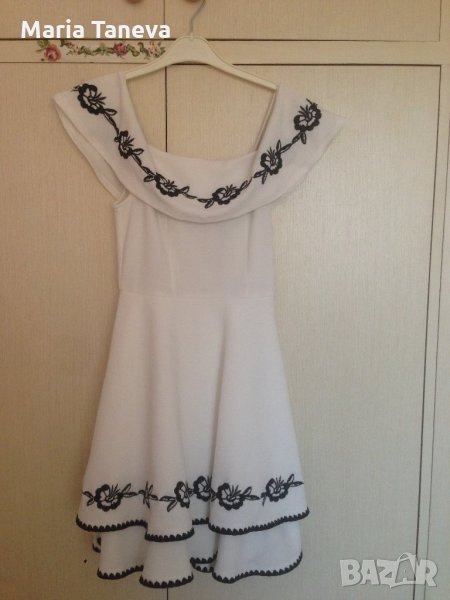 Дамска рокля от бял плат - плътна, тежко падаща материя. Украсата е бродерия с черни конци, има втори волан и подплата. Носи се под раменете и стои много красиво. Дължината на роклята е 77 см. Разстоянието от деколтето до талията е 27 см, обиколката на талията е 64 см. Подходяща е за млади момичета, за официални поводи и за абитуриентски бал също.Обличана е един път на дипломирането.