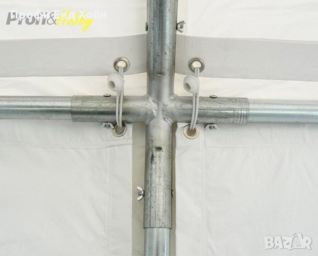 Тази шатра разполага с много лесна за монтиране конструкция от поцинкована стомана с антикорозионна защита и подсилен PVC брезент с тегло 500 г/м2. По-здравият покривен материал осигурява висока слънцезащита UV 80+, издържа на силен вятър и е 100% водоустойчив.