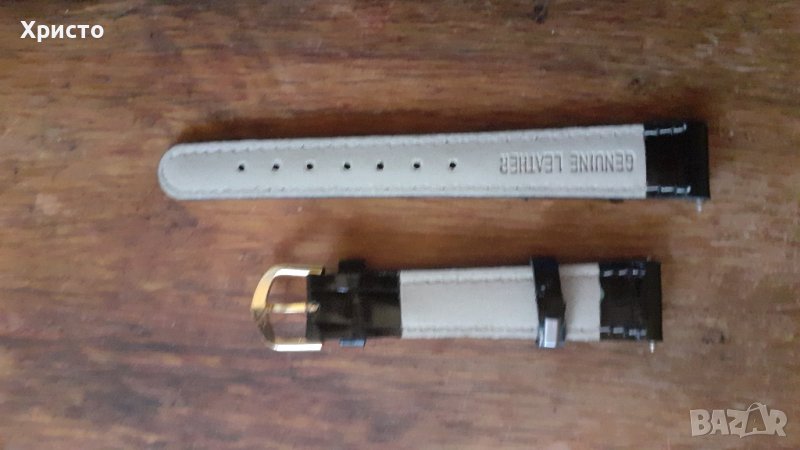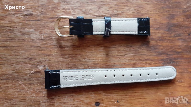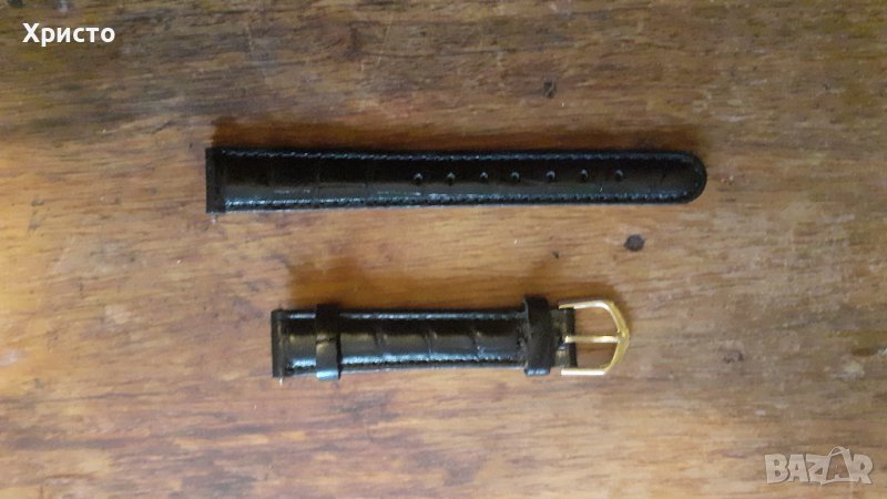 Снимки от 1 до 4 - черна релефна кожа, ширина на каишката при патента 1,4 см, дължина на частта без закопчалката 10,5 см, дължина на частта заедно със закопчалката 7,3 см. Лъскаво релефно черно, със златна закопчалка, има и 2 патентчета - имам 1 брой, цена 8 евро.