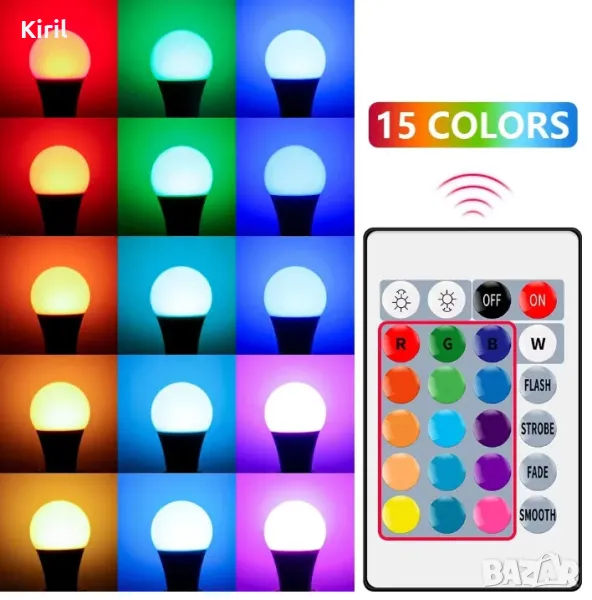 Многоцветна и много режимна LED лампа; Възможност за управление с дистанционно; Има няколко цветови варианта; Наличие на допълнителни ефекти; Дълъг срок на живот; Напрежение (V): 85-265V Ъгъл: 280 градуса Живот: 30000 часа Характеристики: Подходящи за димиране, с дистанционно управление Наличната светлина Цвят: RGB Подходяща за лунички размери диаметър 50 мм дължина 60 мм LED лампата е прекрасно украшение за всеки дом. С нея можете да създадете неповторима домашна и уютна обстановка. Подарете си едно невероятно изживяване и създайте романтична атмосфера заедно с LED крушка с дистанционно управление в различни цветове. Изработена по иновативна LED технология; Нисък разход на енергия; Възможност за промяна на яркостта; Създава уютна, домашна и романтична обстановка; С тази LED цветна крушка с дистанционно управление имате реалната възможност бързо и лесно да преобразите скучния интериор, а също така за секунди да се подготвите за парти вкъщи или в офиса. Крушката е съвместима със всякакви типове статични лампи. Ако желаете, можете да я прикрепите и към мебел или друга част от обзавеждането и декора в стаята, защото с дистанционното управление ще можете да навигирате потока светлина, откъдето си поискате. Магнетичната LED светлина е изцяло безвредна и недрзнеща очита. Крушката издържа в активен режим до 50 хиляди часа. Направете живота и дома си по-цветен! LED цветна крушка с дистанционно управление е идеалният вариант да смените обстановката, без дори да напускате дома си. А и тя пести в 10 пъти повече енергия от стандартната ви бяла крушка в която и да е стая от дома ви. Характеристики: