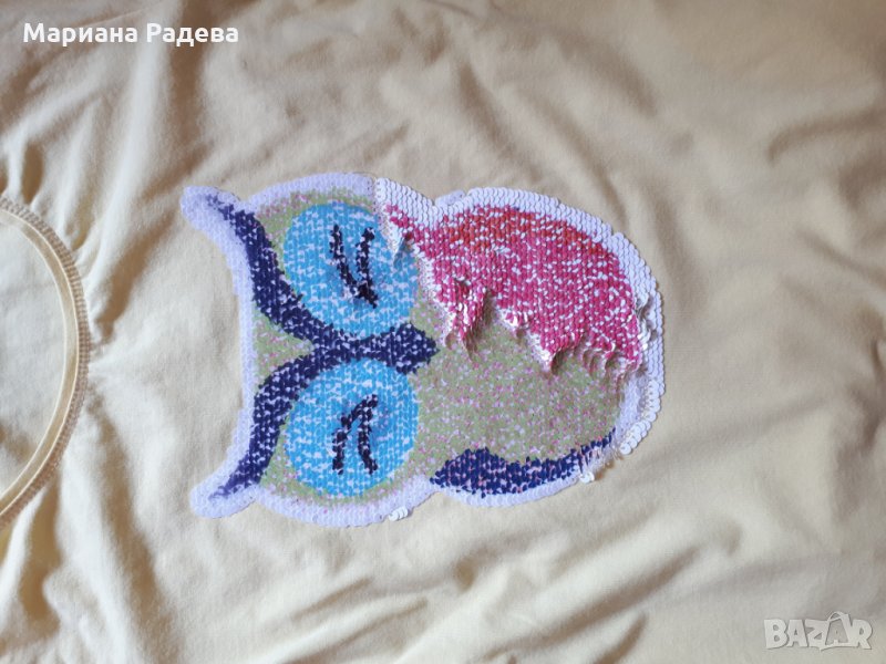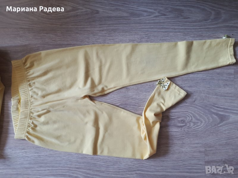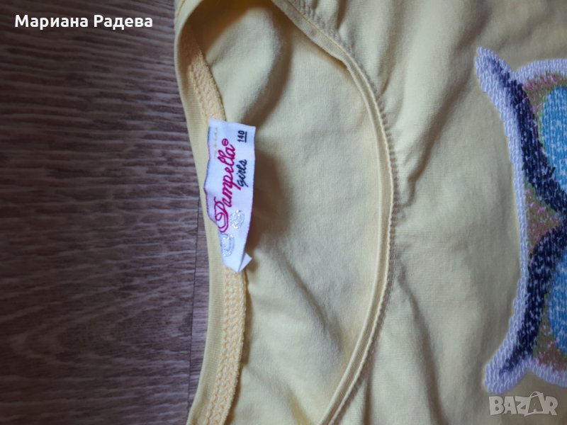 Детски памучен комплект в жълто. Картинката на блузата е с обръщащи паети. Клина е с панделка отстрани на крачола. Ползван по повод.Подходящ за 11-12 годишна госпожица.