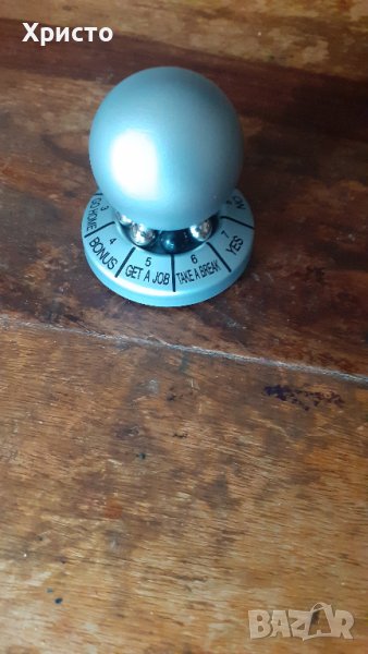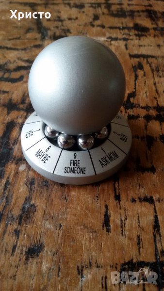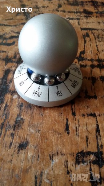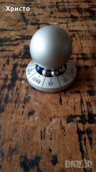 Продавам десижън мейкър decision maker, игра за взимане на решение метално топче. Колебаете се за взимане на решение. Завърта се голямото топче с ръка, малките топчета започват да се въртят и синьото, което е едно спира на отговорът на вашия въпрос. Има вариант и с черно топче. Стабилно и метално е. Може да се ползва и за преспепие. Държите си го на бюрото. Височина 5 см, диаметър на основата 5 см.