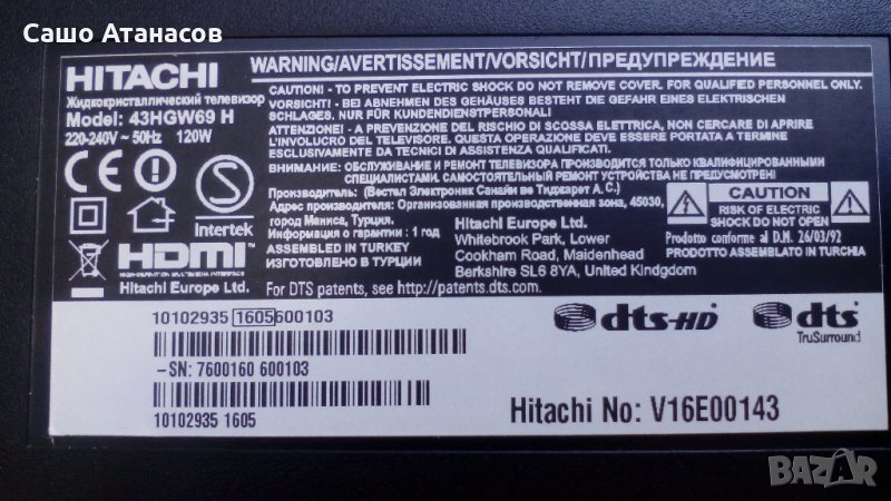 HITACHI 43HGW69 H със счупена матрица ,17MB120 ,17IPS72 ,6870C-0552A ,VES430QNEL-2D-U01 ,17WFM03