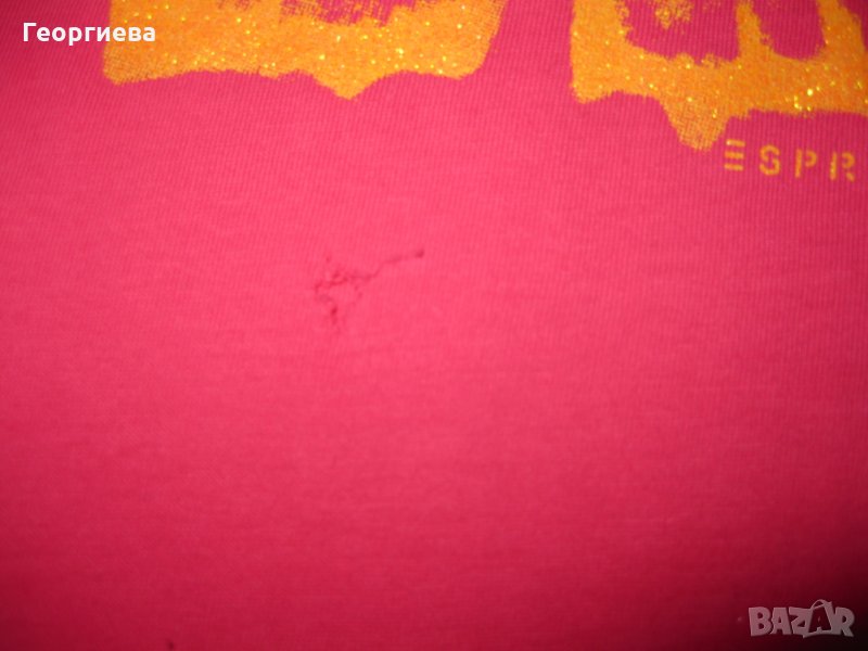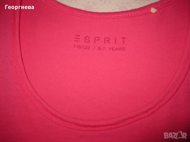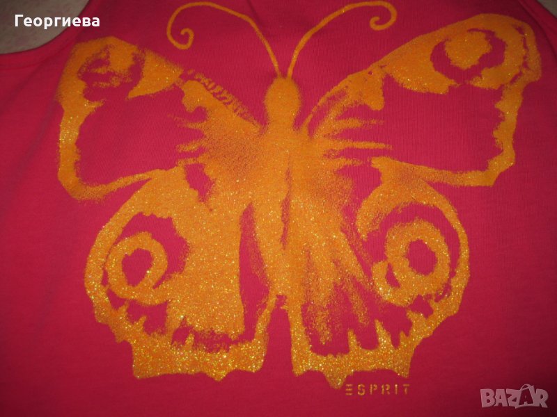 При покупка на туниката и рокличката, подарявам последната рокля на Esprit. Много красива и удобна, качествено и меко трико, с разкошна златиста пеперуда. За съжаление със забележки, затова и я подарявам. Под пеперудата отпред на коремчето малка дупчица и отзад на волана в долната си част, няколко петна, спомен от катерушка и пързалки. Смятах да сложа малка апликация на мястото на дупчицата, но реших да си я оставя така, за да се види реалното й състояние. По етикет 116-122 см., но също леко умалена и е за тази категория.