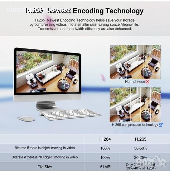 Предимствата на H.265: Два пъти по-ефективен от H.264, като намалява размера на файла до 50% при същото качество. Намалява видео шума и увеличава динамичния диапазон.