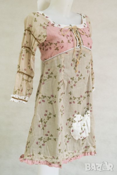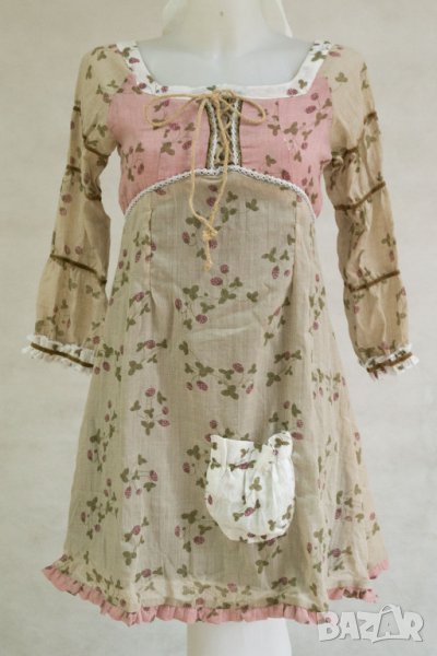 Моделът е леко клоширан, което го прави много комфортен. Декоративна връзка при бюста. Роклята има къдрички при основата и джобче.