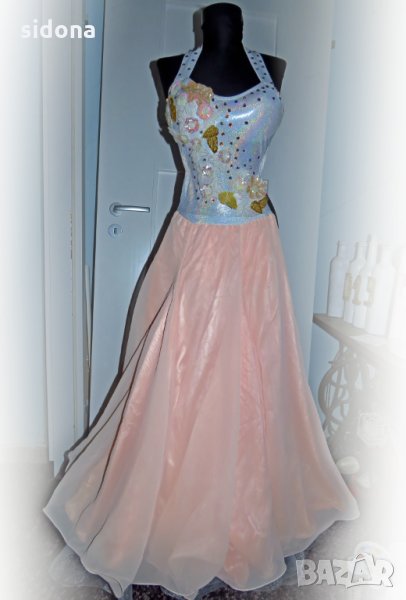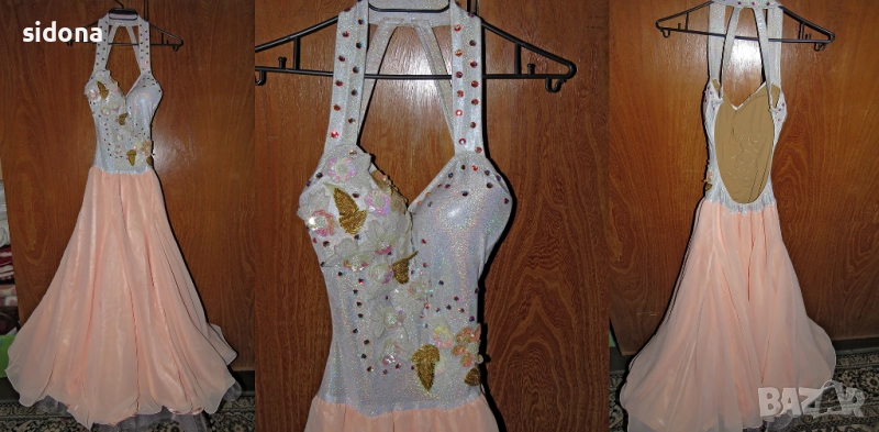 Бална рокля.Изработена от дантела в горната част,с дълъг ръкав,декорация от камъни.Долната част е от сатен и тюл в прасковен цвят.Оформено бельо.