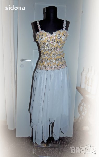 Рокля в бледо сив цвят.Изработена от ръчно украсена дантела с мъниста,пайети и камъни.Долна част от шифон.Оформени чашки.