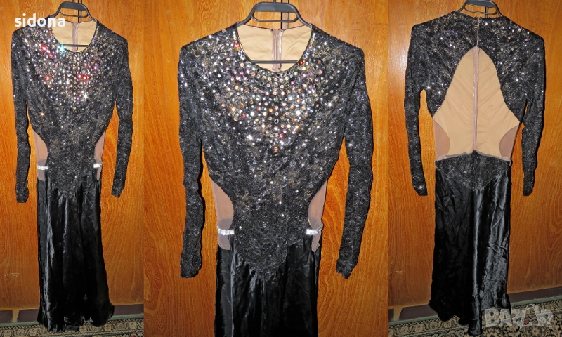 Черна рокля с дълъг ръкав, с дантела в горната част,декорирана с множество камъни.Долната част е от сатен с две цепки.