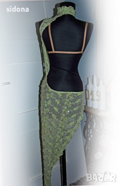 Рокля "Резеда"-бледо зелена рокля ,изработена от дантела,асиметрична,с пришити мъниста.Има оформени чашки и бельо в телесен цвят.