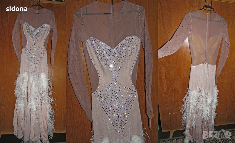 Рокля "Пепел от рози"-изработена от мрежа,трико,с цепки,декорирана с пера и множество кристални камъни.