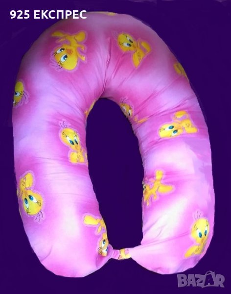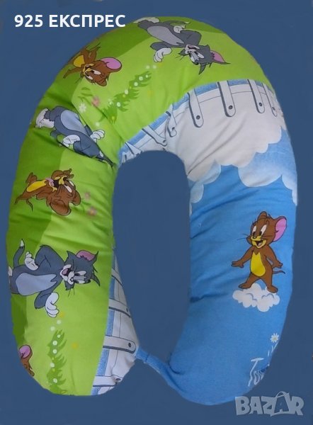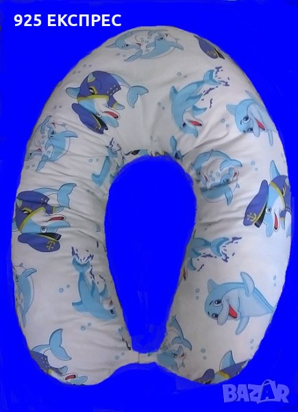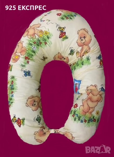 възглавница и калъфка с цип.На калъфката от външната страна има тик-так копче за лесен захват в периода на кърмене. Възглавницата може да се използва и като столче /огъва се извитата част като облегалка/. Удобна е и за деца над 1година. Пълнежа е полиестерна вата, мека е и не запарва.