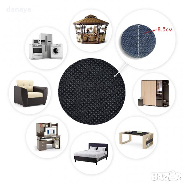 Предпазни подложки за мебели голям размер - 8.5см диаметър. Самозалепващи подложки за големи мебели - легла, скринове, масивни маси, фотьойли, гардероби и други. Предпазват подовото покритие от надраскване. Протекторите са изработени от мека гума, която не позволява хлъзгане на мебелите. Подложките остават незабележими, но с практично и полезно действие.