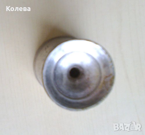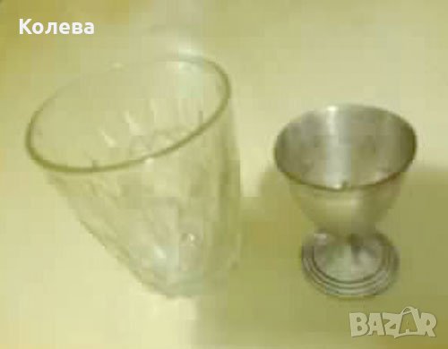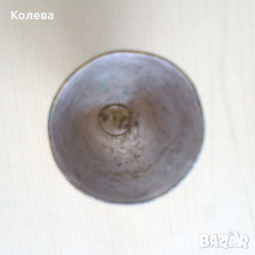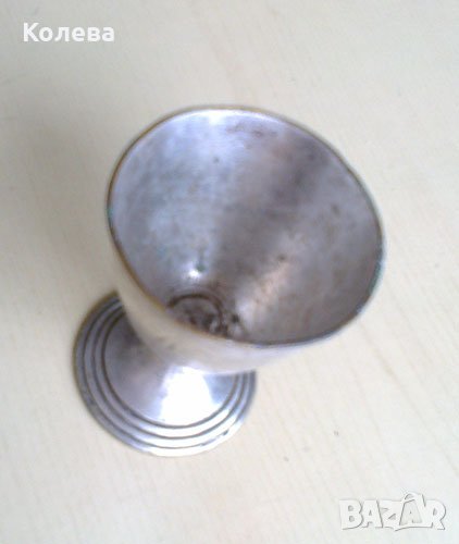 Старинна малка метална чашка /размери на ракиена/ със специални функции. Посребрен месинг. Вероятна употреба – за олиото пред домашен олтар. Доста стара. По три орнаментни линии горе под ръбчето и долу по основата на столчето.