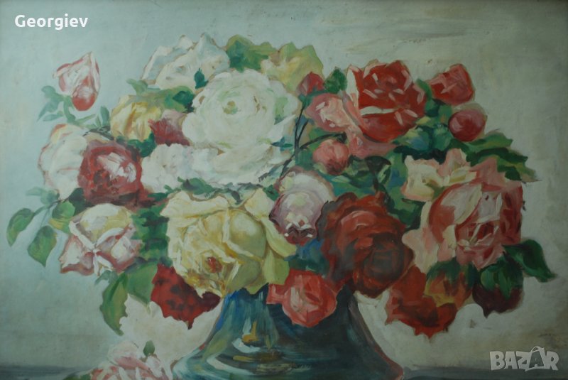 Стара картина,ваза с цветя, български автор, 1950-те год. → Обява 22823989
