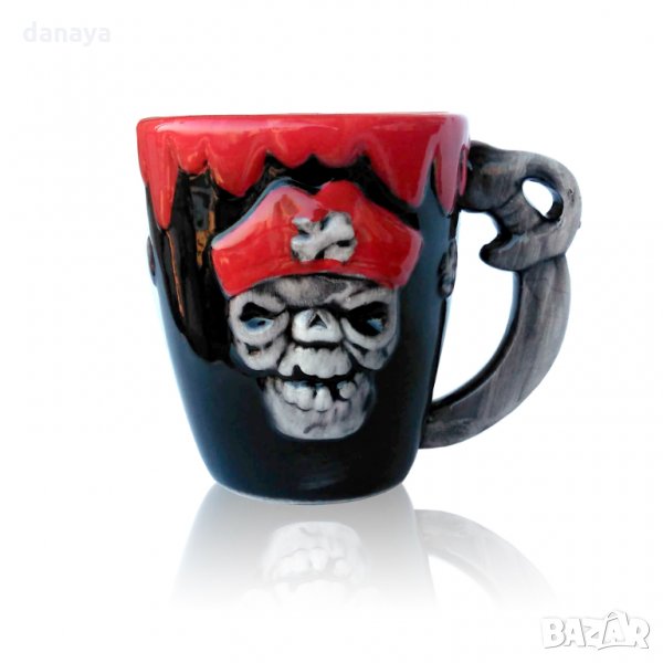Нестандартна подаръчна чаша за чай, кафе или други напитки с изобразен пират череп върху нея. Чашата е много лека и гладка, приятна на допир. Забавен сувенир, чаша идеална за подарък за Хелоуин или друг повод.