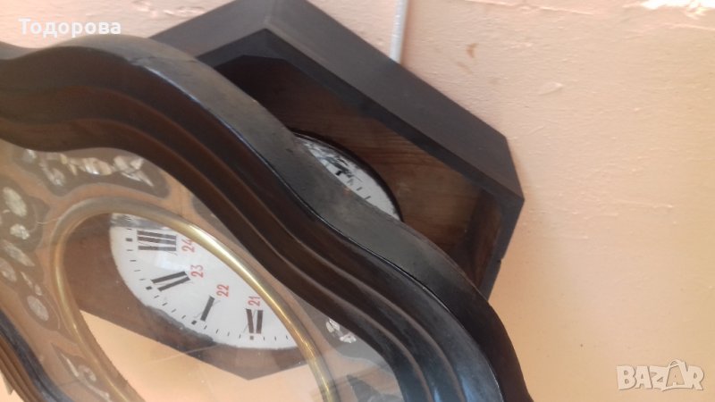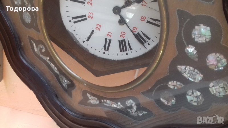 Старинен стенен механичен часовник.Ръчна изработка.Бутиков.Предният панел със седефени орнаменти.Механизмът работи отлично.Циферблатът се нуждае от реставрация-напукан-видно от снимките.Размерът на лицевия панел -50 х 60 см.