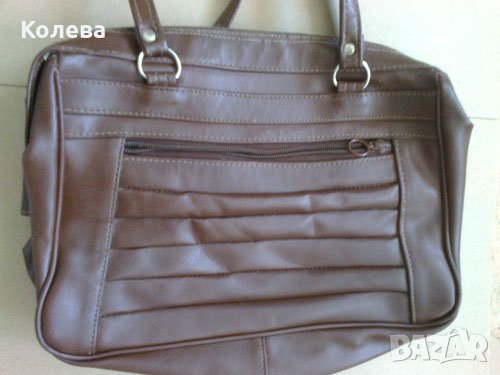Удобна ежедневна дамска чанта в кафяво. Две прегради и джобче, меко дъно, външен джоб. Събира сгъваем чадър. Цена 6 евро.