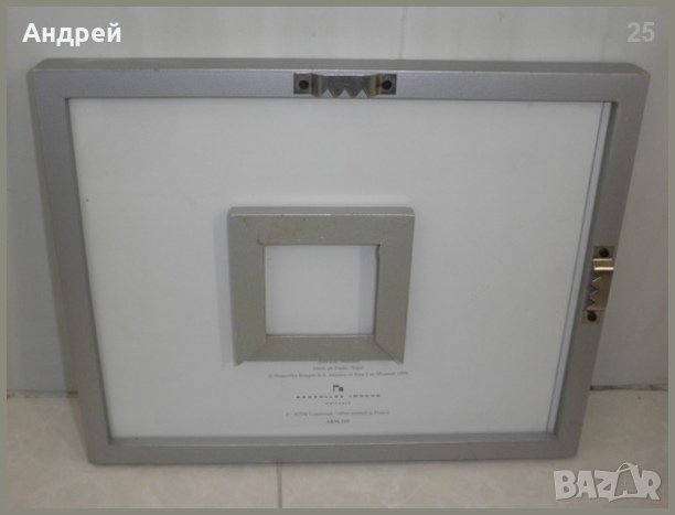 Сива пластмасова рамка за картини/снимки.Размерите са:дължина-25,5 см.,височина-20,5 см.,ширина-1,8 см. Сребърната пластмасова рамка предпазва отпред и отзад снимката/картината чрез стъкло.На задното стъкло е залепена малка рамка като с нея то се преплъзва,за да се сменят снимките/картините с...”вярната” големина...