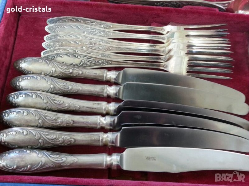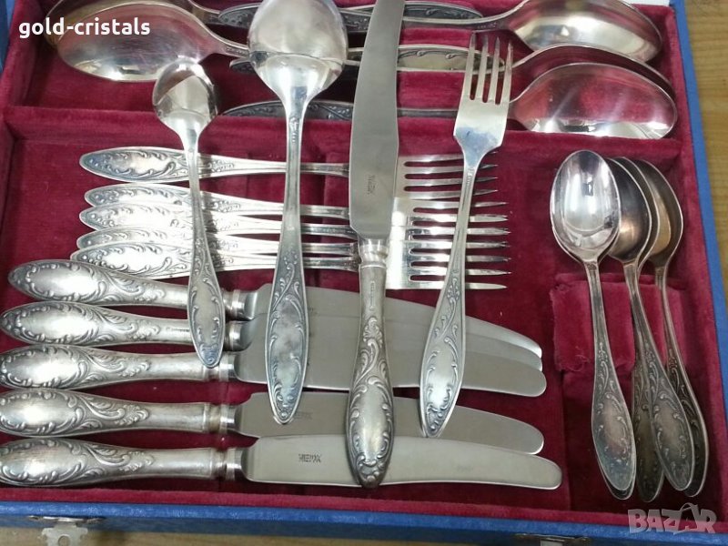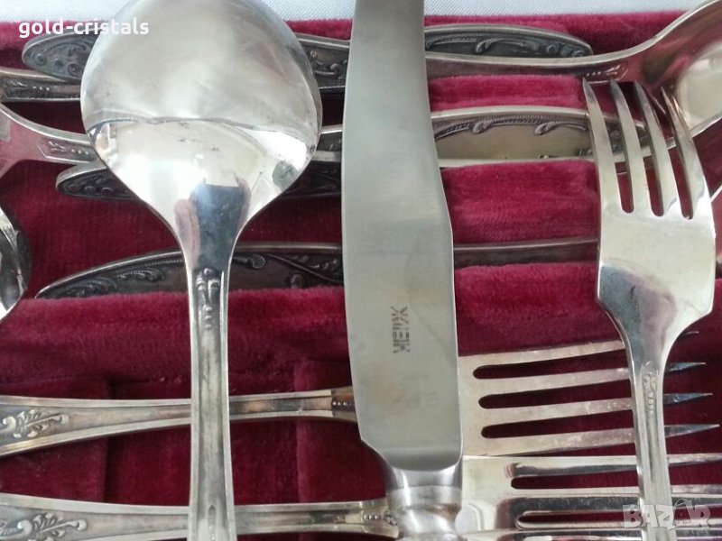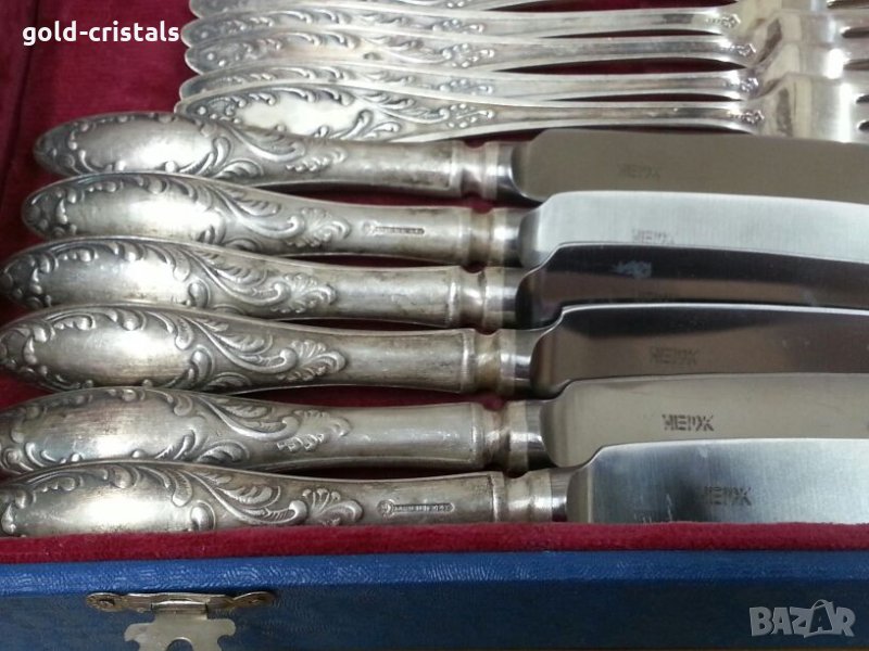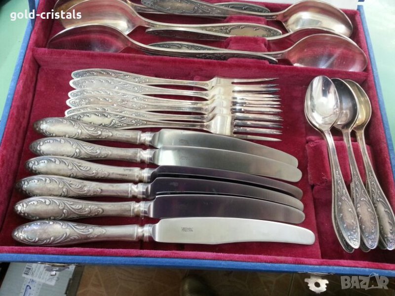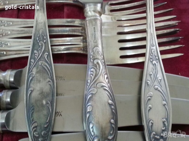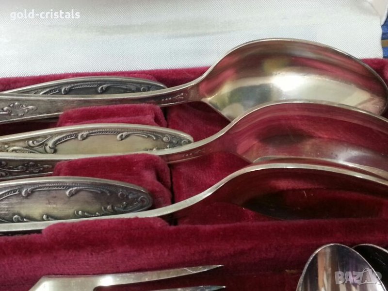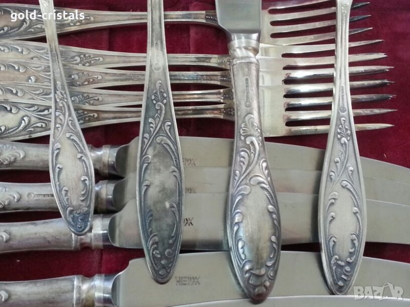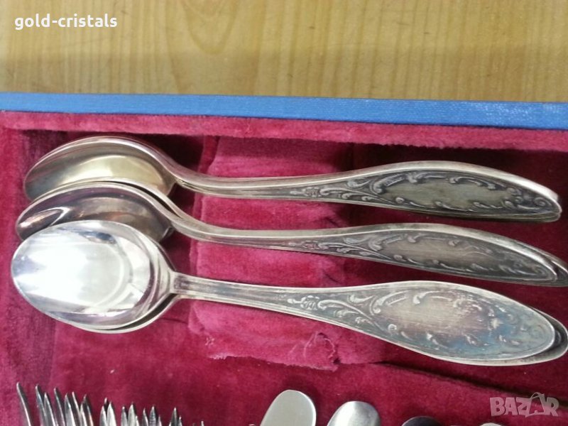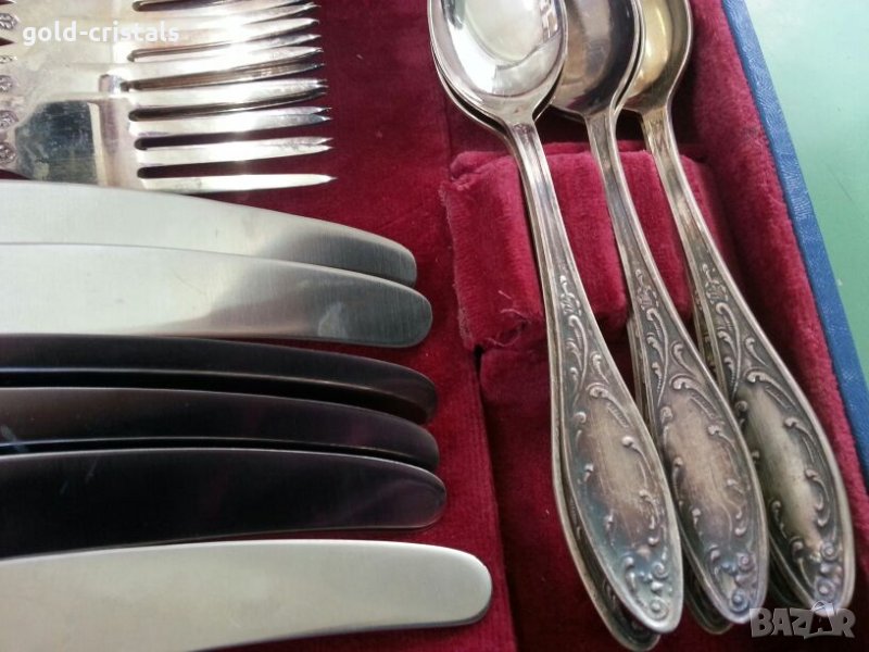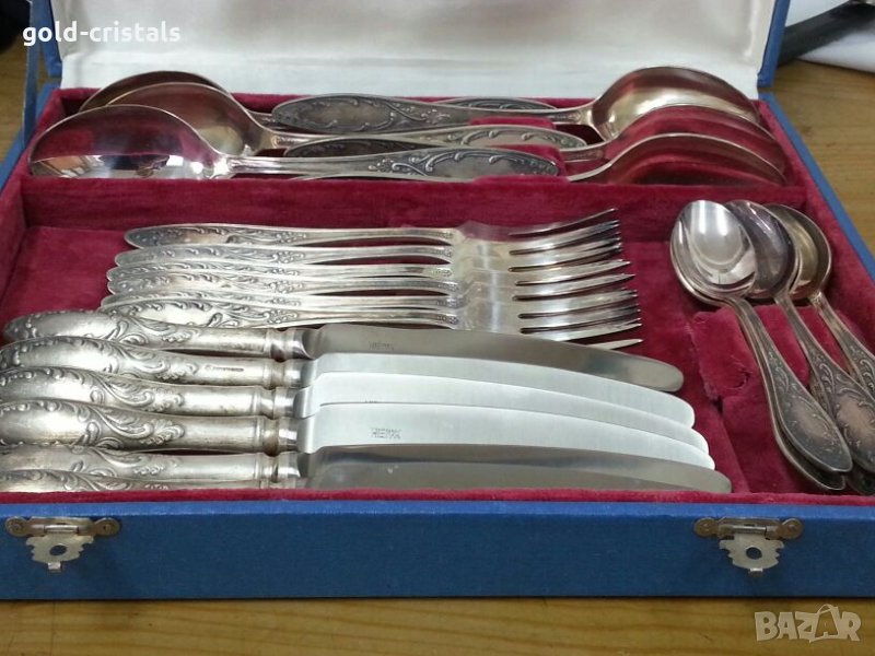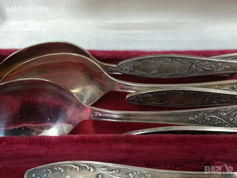 Старинни руски посребрени прибори за хранене в куфарче 6бр ножове 6бр вилици 6бр лъжици 6бр малки десертни лъжички маркирани съветски ссср сервиз комплект сет лот ретро арт декор винтидж колекция стари антикварни предмети обзавеждане за дома и семейството подходящи за подарък за ценители и колекционери