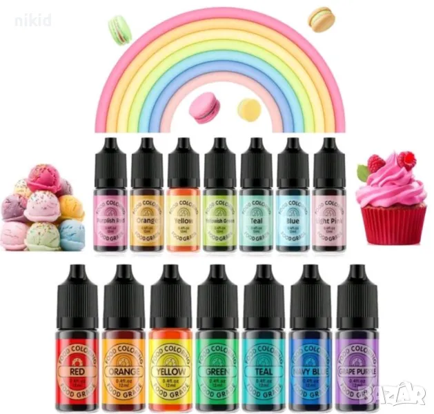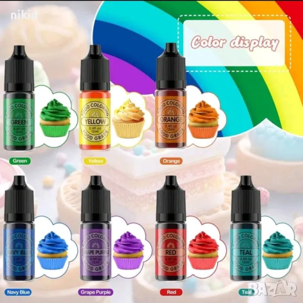 10 цвята течна сладкарска боя оцветител за фондан крем сметана тесто украса декорация → Обява 22889491