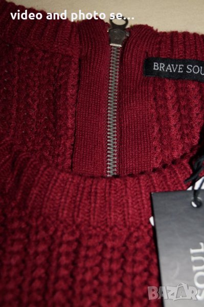Зимен пуловер в цвят бордо на английската марка Brave Soul . С апликация отпред и метален ефектен цип отзад на врата . Нов с етикет.Състав:акрил.