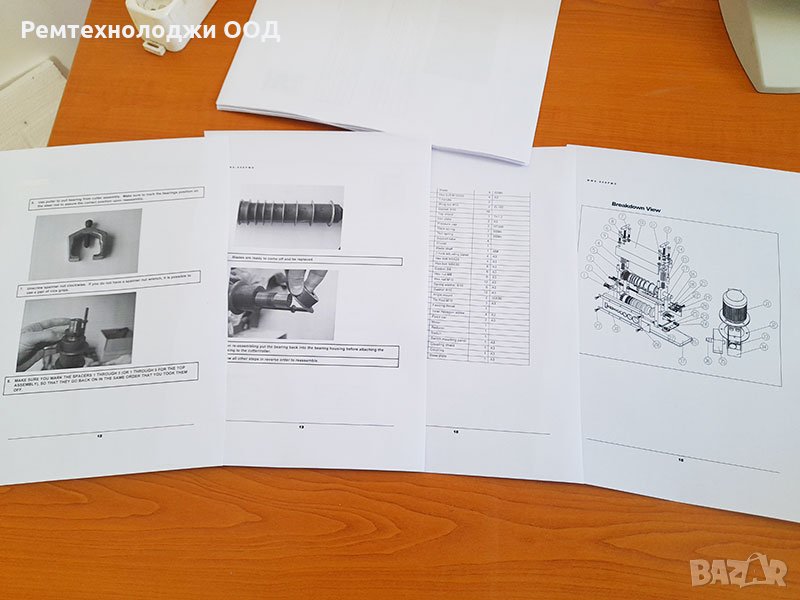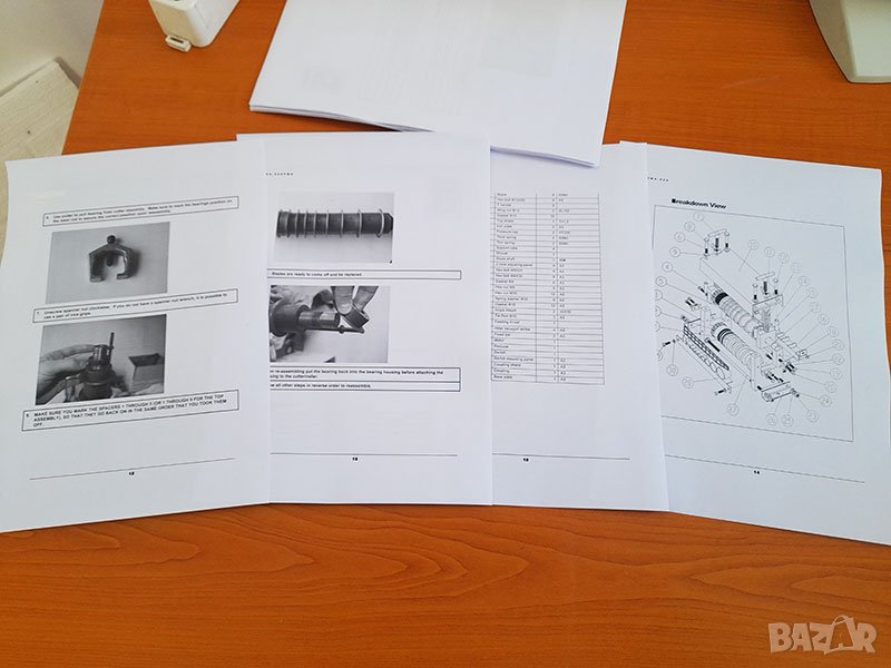 Осигурен сервиз работещ от близо 10 години, налични резервни ножове, части и консумативи. Предоставя се много подробно ръководство 17страници с картинки за обслужване и ремонт на машината (вижте снимките). Безплатна консултация.