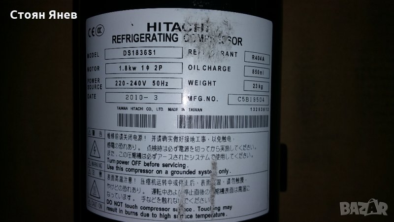 Хладилен компресор Hitachi - ScrollТип : спирален Модел: ds1836s1 Работен фреон : R404AМощност: -2 1/2HP, -HMBP: 4721W, LBP: 1540W. Изпарение : +10 to -45°C Аналог на Copeland ZF09 Подходящ за хладилни бусове - мерцедес Спринтерза контакт : Стоян Янев - 0897886002Whatsapp : +359-897886002