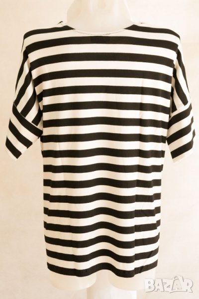 Нова е, не е обличана!Дамска блуза от марка Colors by Mia. Моделът е на бяло и черно райе и е декориран със сърце отпред. Има къси ръкави, обло деколте и свободна линия. Блузата е леко еластична - съдържа 95% вискоза, 5% еластан.
